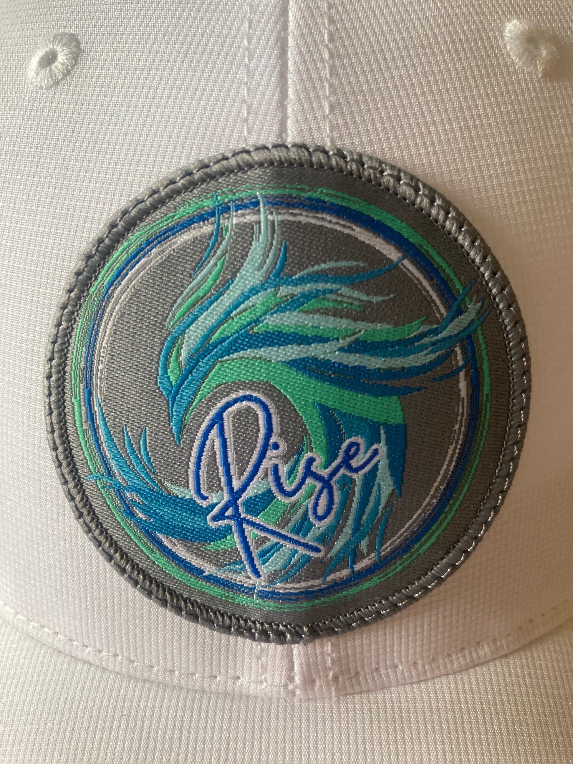 - Phoenix "Rise" 2.5 inch woven patch in shades of blues and aqua